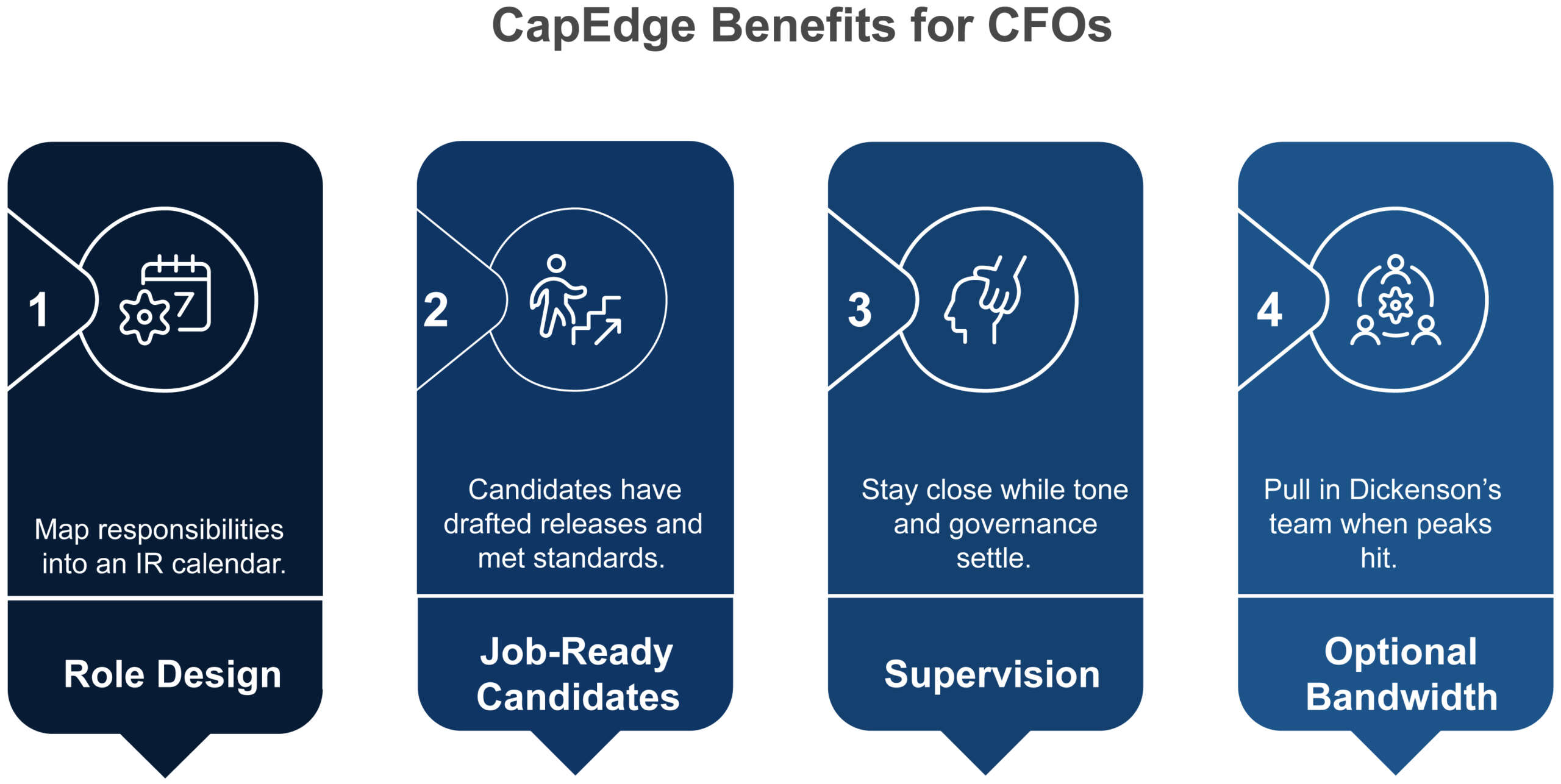 If you are a CFO building a team, CapEdge shortens your ramp and reduces your supervisory load. If you are a finance or communications professional ready to enter IR, CapEdge gives you a portfolio, a mentor, and a seat at the table.